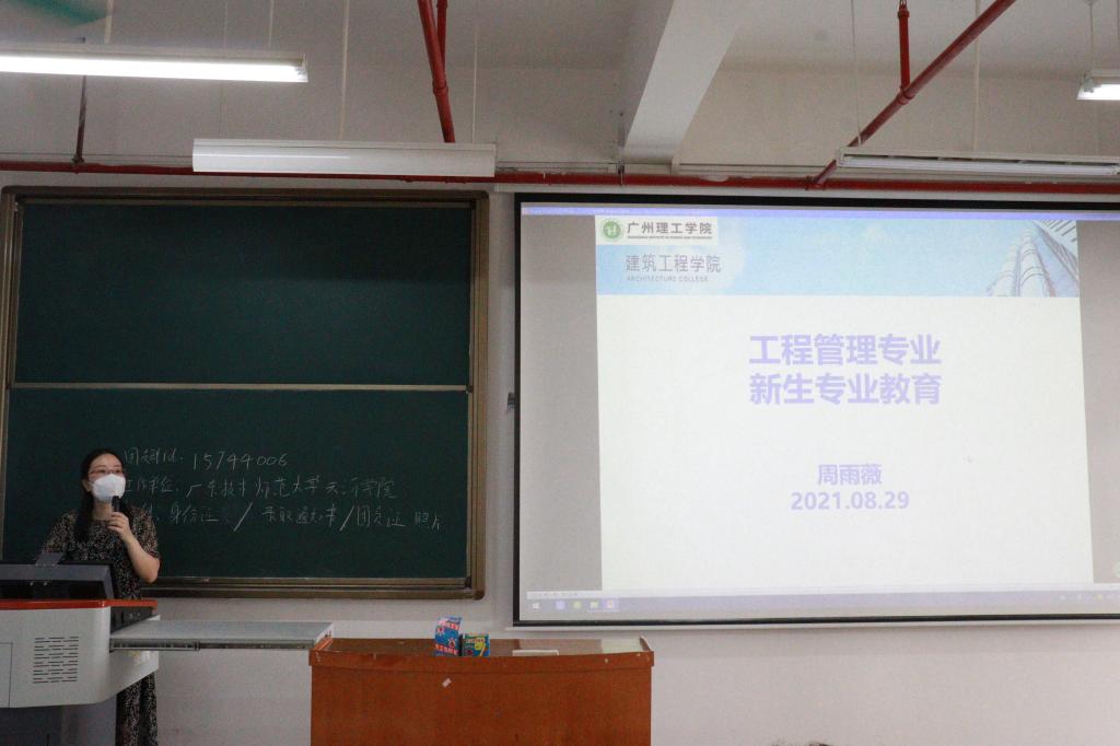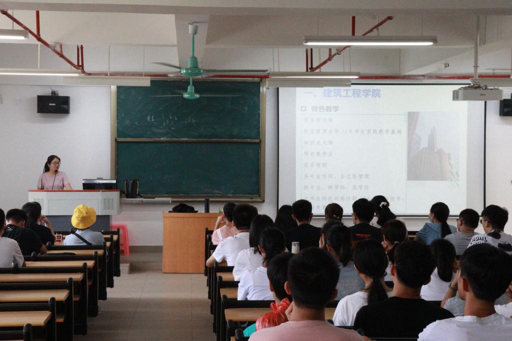 张莉娜老师向新生们介绍了师资力量,教学设备,各大实验室等,并且介绍我院的特色教学。然后向新生们介绍什么是工程造价、工程造价的行业发展以及未来BIM技术的发展前景。以及毕业后的就业方向与未来的职业生涯。