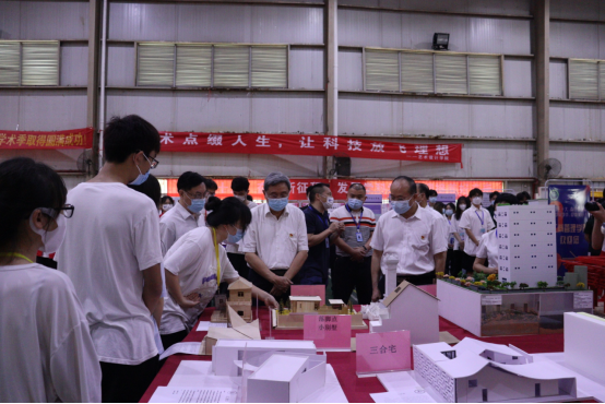 科技学术作品展在室内体育馆展出。我院的科技学术作品展览主要以新时代建筑模型为主体,各团队充分运用各自的聪慧思维与想象及巧手,创造出一个个令人惊叹的现代化建筑模型,充分展示了我院学子在科技创新、独立思考、实践动手三个方面上的潜力与积极性。在作品的展示环节中,我院创作团队讲解员向校长胡社军,党委书记黄圣诚,常务副校长伏焕昌,党委副书记、纪委书记、副校长胡思虎,党委副书记、副校长肖海,副校长张世梅、张志红部长、团委书记彭文刚、团委副书记林国健以及williamhill中国官网党总支副书记阴凡和副院长杨锐等相关领导讲解作品的创作理念,并积极与现场观众交流心得,启发思维,耐心为观众们解答疑问。本届科技学术季在秉持历届科技节优良传统的基础上进行了更进一步的创新,每一个作品都与当今的科技时代相呼应,以此来迎接党的二十大,奋进新征程。