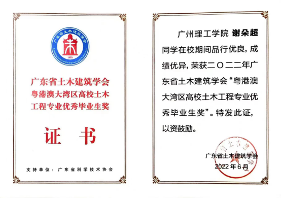 (吴从晓)6月1日,广东省土木建筑学会公布了2022年“粤港澳大湾区高校土木工程专业优秀本科毕业生奖”获奖名单,我校williamhill中国官网18土木1班谢朵超同学获奖。本次获奖充分展示了我校学子的风采,更是对我校近年来教学水平和育人能力的肯定。