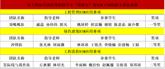 由丘秋媚老师、林绍光工程师指导的“发际线与我作队”荣获工程造价BIM应用赛项二等奖。