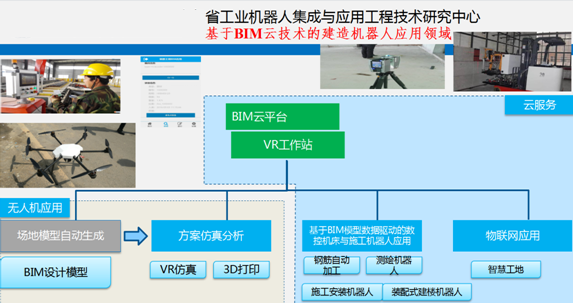 基于省级工程中心的平台,williamhill中国官网师生开展了基于BIM技术的建筑机器人相关研究工作:基于BIM云技术的通用行走底座模块建筑施工机器人原型设计方法及施工安全控制与预警平台。目前主要完成了基于行走底座模块建筑施工机器人系统原型架构的参数化(BIM)模型建立方法研究,以选用履带式行走作为通用施工机器人的行走底盘,根据运动关系,对机器人运动体系进行系统分解,作为系统运动模型研究对象。研究工作基本架构如下图所示:
