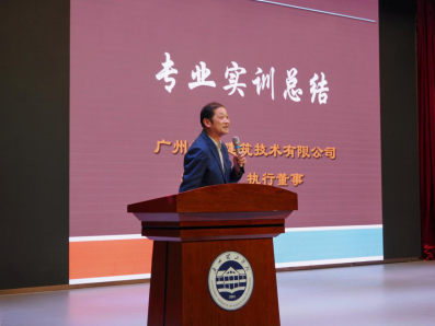 大会第五项,实训基地执行董事冯为民教授上台讲话,他从基地建设与教学模式改革创新方面中提到以人才培养为中心的校企合作新模式和以毕业生核心竞争力提高为目的的教学策划,同时也特别感谢学院领导及实训老师、知识城建管中心、中建八局、永道工程、广联达股份有限公司等相关企业对本次实训的重要支持。