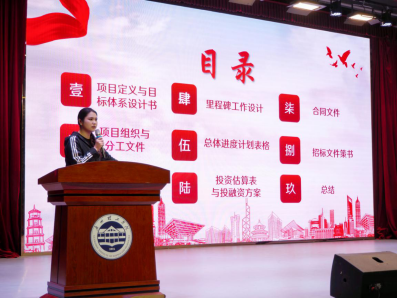 大会第二项,各班优秀小组成果汇报及老师评分。每班各选一个业主方与总承包方优秀小组,汇报为期两周的实训成果。同学们都以在建实际工程禾丰希望小学教学楼为研究对象,模拟业主方或者总承包方的身份,对一般的民用建筑整个建设过程中,对工程进行总体任务的分解、项目组织机构与流程设计、招标文件的策划以及合同文件的策划等内容进行综合训练。