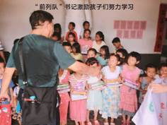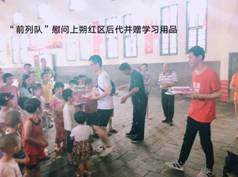 红色上朔村至今还有200多先烈的亲属生活在这个村子,其中还有一位先烈的遗孀独居本村。得知这一消息,为告慰先烈我们后辈共产党员应该有义务给予他们尽可能的帮助,我们在村的大会堂进行了慰问活动。为了培养红区后代,为其创造更好的学习条件。我们带去的日常用品、书籍全部捐赠给上朔村的儿童。其中捐赠的有:科普知识读本42本、玩具布偶8个、25份学习工具套装以及笔记本60本等。捐赠对象是8名学前班幼儿,11名一年级学生,8名二年级学生,5名三年级学生。捐赠仪式上李华东书记带动全场儿童挥手表示要“好好学习,天天向上”;一心跟党走,做优秀的红后代,做一个共产主义事业的接班人。