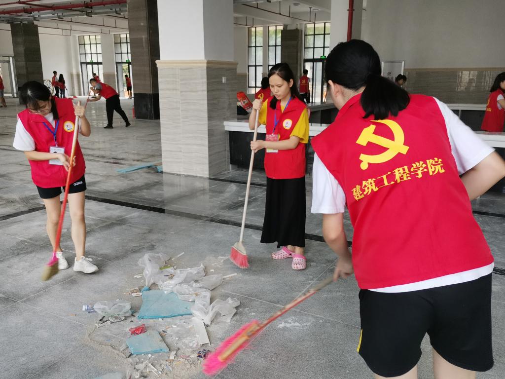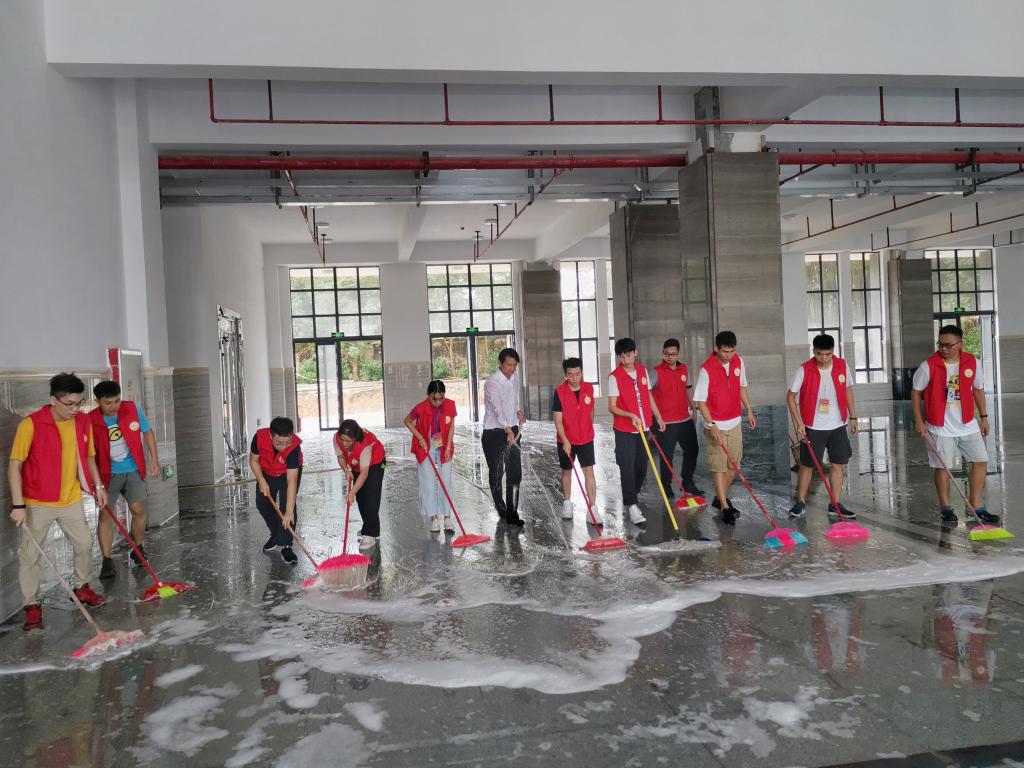 活动中,党员们充分展现了不怕脏、不怕苦、不怕累,敢于冲在前面、抢挑重担的精神风貌。有的用铁锹铲除粘在地板上的水泥污点,有的用扫帚清扫地板,有的把大块的废纸、塑料袋等建筑废料捡进垃圾袋,有的用清洁剂冲洗地板,大家热情高涨,以劳动为荣,乐在其中,经过几个小时的努力,新行政楼焕然一新,以它最美的姿态迎接新学期的到来。