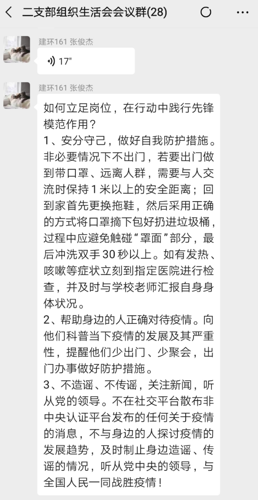 会上,党支部书记曾远秀老师就疫情防控期间开展网上专题组织会议做出要求。通过学习习总书记的重要讲话和中央重要文件,党员要充分认识到疫情防控工作的重要性、急迫性,强化党员在疫情防控工作的使命担当,确保发挥先锋模范作用。接着,全体党员就“如何立足岗位,在行动者践行先锋模范作用?”依次发表意见。①做好个人防护,并提醒身边人做好防护工作;②每天及时在今日校园APP打卡,主动上报个人健康和出行状况;③积极带头,配合学校做好“停课不停学,学习不延期”的学习任务;④“不信谣,不传谣,不造谣。”最后,党支部副书记曾鑫凯对会议情况进行总结发言。