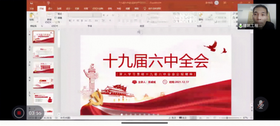 (通讯员:高慧妍)12月17日晚,我院学生第一党支部组织全体在校党员与预备党员线上学习 “中国共产党第十九届中央委员会第六次全体会议公报”精神,支部书记张威威主持会议。