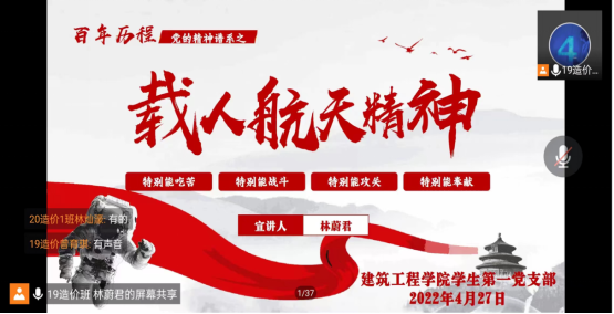 (通讯员:刘新粤)4月27日上午,我院学生第一党支部采取线上形式组织召开载人航天精神学习会议。本次会议参与人员为我院学生第一党支部全体在校党员、预备党员及入党积极分子。会议由林蔚君同志主持。