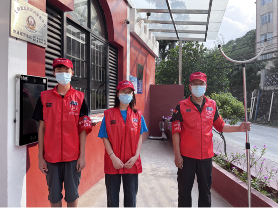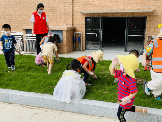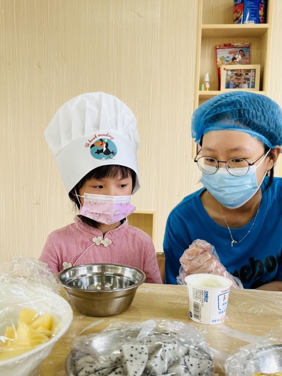 活动过程中,同志们作为小老师协助主教老师照顾小朋友,如陪小朋友们看书,看护小朋友们午睡,指引小朋友们一笔一画练好字等。此外,这三天每一天都有一项特殊活动,带领小朋友一起制作酸奶水果捞;一起清扫校园卫生;教小朋友分辨冰糖和盐。受疫情突发的影响,同志们和老师一起带领全体小朋友们前往穗丰村服务中心做核酸检测。在此过程中突发暴雨,为防止小朋友们淋雨感冒,同志们纷纷脱下志愿者服为小朋友们挡雨,这一举动受到了幼儿园老师们的一致好评。