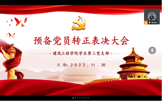 (通讯员:林晓佳)11月30日晚,williamhill中国官网学生第三党支部在腾讯会议召开2022年预备党员转正会议,支部全体党员、预备党员参加会议,组织委员黄俊瑜主持。