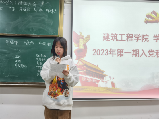 卢雨霓同志先对本次推优大会的情况进行了介绍。随后,入党申请人依次上台向党组织汇报个人情况。汇报完毕后,支部党员和预备党员进行综合考察讨论,并以无记名投票的方式,选出入党积极分子。这些同学在学习上刻苦拼搏,积极向上;在生活中与他人和睦相处,团结友爱;在思想上积极向党组织靠拢,认真学习党的相关历史与精神内涵。