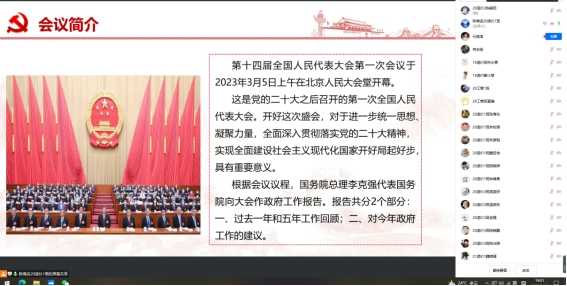 (通讯员:林灿濠)3月15日晚,为使同志们及时学习、领会两会精神,全面深入贯彻落实党的二十大精神,我院学生第一党支部组织全体党员在线上学习2023年《政府工作报告》,陈海运同志主持。