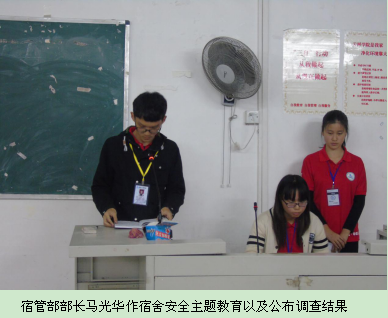 继一段关于宿舍安全宣传片后,宿管部干事林万湖给大家介绍了宿舍保修流程和阅读宿舍管理制度条例。同时宿管部部长马光华就宿舍的整体情况作了总结,对宿舍的安全、纪律、内务整理等方面的调查结果进行了公布。随后,钟任鹏书记为获得“红旗宿舍”的宿舍代表颁奖。李华东书记在会上指出,每个宿舍长要坚守职责,起带头模范作用,并强调了严禁在宿舍内使用明火、违禁电器,严禁携带烟酒、有毒、有害、易燃易爆等危险物品进入宿舍,提高警惕,注意防盗,共同营造安全、文明、和谐的宿舍环境。