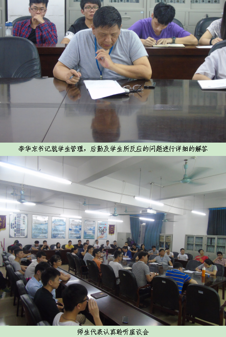会议开始时,侯庆华副院长主要围绕学生反映关于“教学条件”、“学生管理”、“校园环境”、“生活服务”等问题进行汇总。接着,李华东书记就学生管理,后勤及学生所反应的问题进行详细的解答。他说,学校正在改善和实施可采取的意见,如宿舍安装空调,对教学楼的桌椅进行整修等。班级代表发言环节,老师们强调学生“无手机课堂”,指出现在大班教学存在很多学生玩手机的现象。同时,老师们也认真记录了学生提出的意见和建议,并当场进行解答,与学生们形成共识。最后,黄良辉副院长为座谈会做总结。他指出大学生要适应生活,独立解决问题,学校方面出现的问题,找对部门解决,提高解决问题的效率。