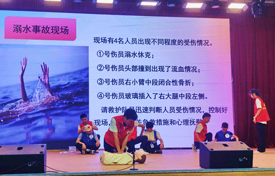 比赛包括三个环节,主题演讲、理论知识答题、场景演练。其中,理论知识答题涉及应急救护基本知识、公共卫生突发事件医疗救援等内容。场景演练考核心肺复苏、包扎两项急救技能,要求参赛队伍现场模拟呼吸心跳骤停、创伤出血骨折、头部受伤等伤情的急救。
