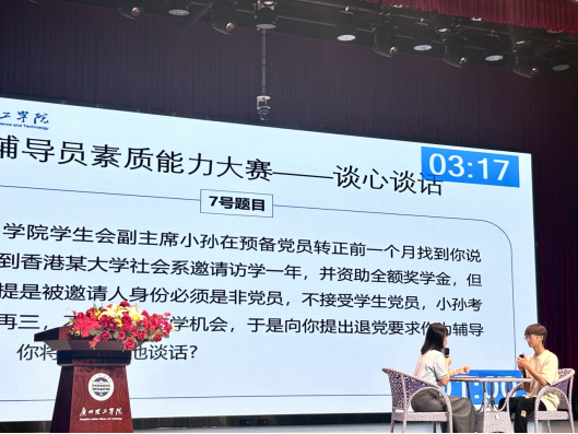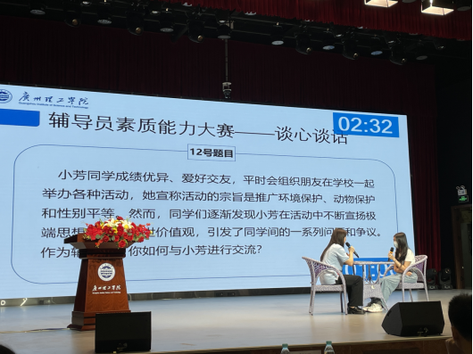 本次大赛共分为初赛和决赛。初赛为辅导员基础知识测试,成绩排名前20进入决赛环节。陈丽冰老师、郑佳老师分别以第12、14名的好成绩进入决赛。决赛分为两个环节,第一环节为案例研讨,20位老师以抽签的方式分为10组,每组两人分饰AB角,以“我提问,你回答”的形式展开研讨;第二环节是谈心谈话环节,以情景再现的方式,与学生展开深入细致的谈心。