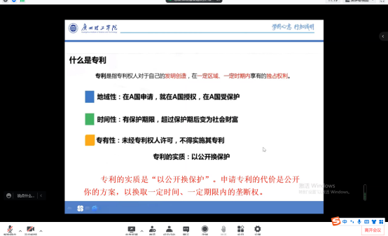 第一场知识讲座为专利申报,由邓珊老师主讲。首先,她从概念、主要内容、保护对象、主体、客体五个方面向同学们分享了知识产权的基础知识。接着,用举例和对比两种表现手法来讲述专利申报的概念和类型。最后以流程图的方式向同学们介绍了专利申报的过程,为我院学子提供专利申报的思路和思维,营造一个良好的知识产权保护的积极氛围,为提高专利申报数量和质量起到积极的促进作用。