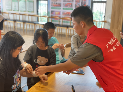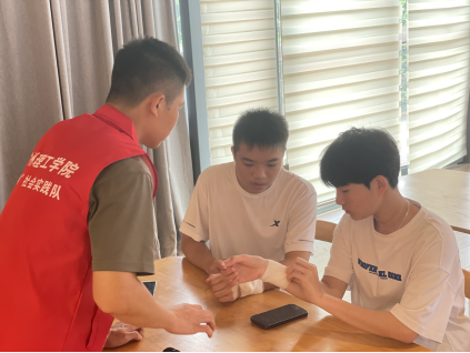 实践队员陈衍徽结合村民生活中遇到的紧急情况,向村民们传达学急救、懂急救、用急救的重要性,并以心源性猝死救援有“黄金4分钟”为例,通过情景再现的方式向观背村村民展示绷带包扎和心肺复苏的正确处理方法。村民们积极参与,兴趣高涨,积极参与心肺复苏和绷带包扎的实际演练,从而掌握应急救护的概念和具体施救方法。