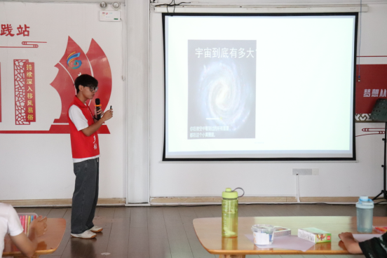 “乡韵”社会实践队队员钟亮通过播放“火箭发射升入太空”的视频为小朋友们揭开太空的神秘面纱,并以图文并茂、互问互答的形式介绍载人飞船和宇宙飞船外观及特点,同时,向小朋友们讲述我国航天英雄“中国航天第一人”杨利伟和“我国第一位女航天员”刘洋的英勇事迹,引发孩子们的好奇心。此外,通过与小朋友们积极互动,鼓励小朋友们充分发挥想象空间,用画笔勾勒五彩的宇宙飞船,用奇思妙想去描绘自己心中小小的航天梦。