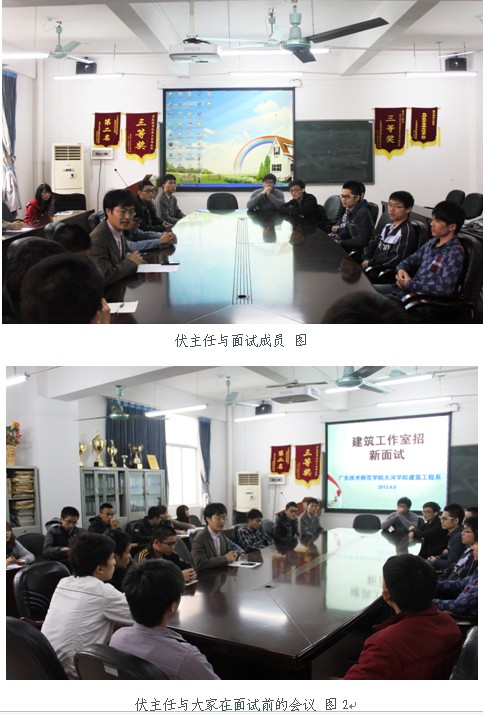 随后,面试成员按笔试排名的单双号分成两组,分别在主任办公室和会议室进行严格的面试考核。考核内容涉及到建筑专业的各科专业知识、学生对生活对学习的积极性、吃苦耐劳精神、团队精神、综合实践能力等等,整个面试过程在紧张而严谨的氛围中进行,每一位成员都带着思考和任务离开,此课程实践任务是由学生自己选择趋向个人兴趣的方案设计、结构设计、工程测量或者工程预结算等,于一周内完成并提交。最后以应聘人员的笔试成绩、面试成绩和作品质量效果的综合成绩确定录取人员,并予以公示。