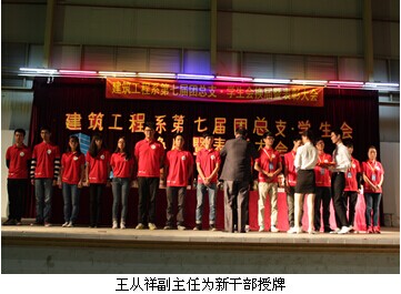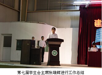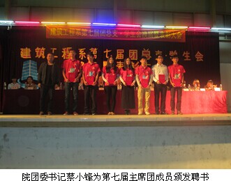 大会在一段记录着我系14个部门在上一学年里工作点滴的视频后正式拉开了帷幕。观看完我系团总支学生会的整体框架以及部门简介后,第七届学生会主席张雄辉进行了工作总结。他的“不要把学生干部当一回事,别不把学生干部当一回事”,令人深思。紧接着第七届团总支副书记黄育谋对上一届优秀干部、优秀部门进行表彰。其中,学生会主席张雄辉荣获院优秀干部,绩效管理部、秘书处和文娱部荣获优秀部门。随后,潘丹丹书记、杨惠主任和蔡小锋书记分别为第七届团总支学生会各部门的副部长、部长以及主席团成员颁发聘书。潘丹丹书记宣读第八届团总支·学生会干部名单,并进行挂牌仪式。仪式完毕后,新一届团总支副书记李永杭、学生会主席郭涛分别进行就职演说。其后,新老两届主席团交接会旗。接着,李华东书记发表了重要的讲话,他强调 “两种模范,两种精神”,即学习的模范、遵守纪律的模范和团队精神、奉献精神,让在座的所有人都受益良多。最后,大家合影留念。
