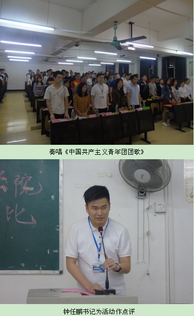 一首《中国共产主义青年团团歌》正式拉开评比活动的序幕,本次评比主要由初审阶段及现场演示两部分组成。各团支部依次通过精心设计的PPT展示团结、积极向上的风采,其中思想建设及团建活动尤为突出,各团支部无论在学习,还是生活方面都展示出团结一心的精神面貌。随后,钟任鹏书记为活动作点评,他分别提出“亮点”、“不足”、“希望”三个点,并鼓励各班级在今后的活动中再接再励。最后,李华东书记作动员发言,他提出五个词:一是“祝贺”,祝贺同学们能在评比中获得奖项的团支部及个人;二是“赶超”,各个支部要相互学习,取长补短,不断向他人学习,努力赶超其他团支部。三是“创新”,改革创新,工作方法、活动方式都要创新,团的工作才会有新的进步;。四是“分开”。理解好团支部与班级的关系,团总支如何与班级配合,各自的责任和任务是什么,才能更好把工作做好。五是“努力”。经常总结经验,发现自己存在的不足,如何努力争取做得更好。通过本次评比有新的努力的方向。