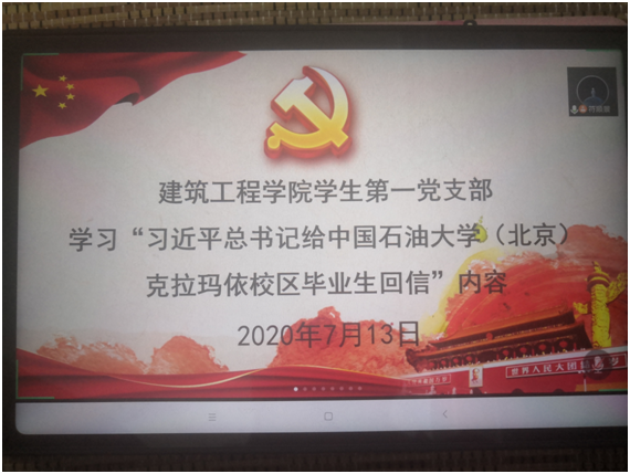 (通讯员:黄小香)7月13日晚,为了让全体党员同志更加深入理解与学习“习近平总书记给中国石油大学(北京)克拉玛依校区毕业生回信”,我院学生第一党支部组织全体党员同志在腾讯会议共同学习此次的回信内容。
