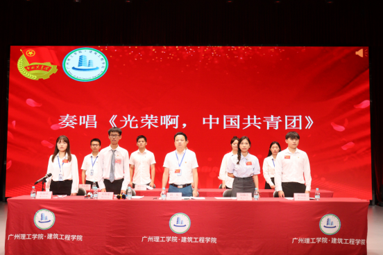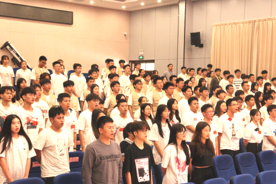 在雄壮的国歌声中,同学们全体起立,共同奏唱国歌,大会正式开始。邓伟梁、陈丽冰主持会议。