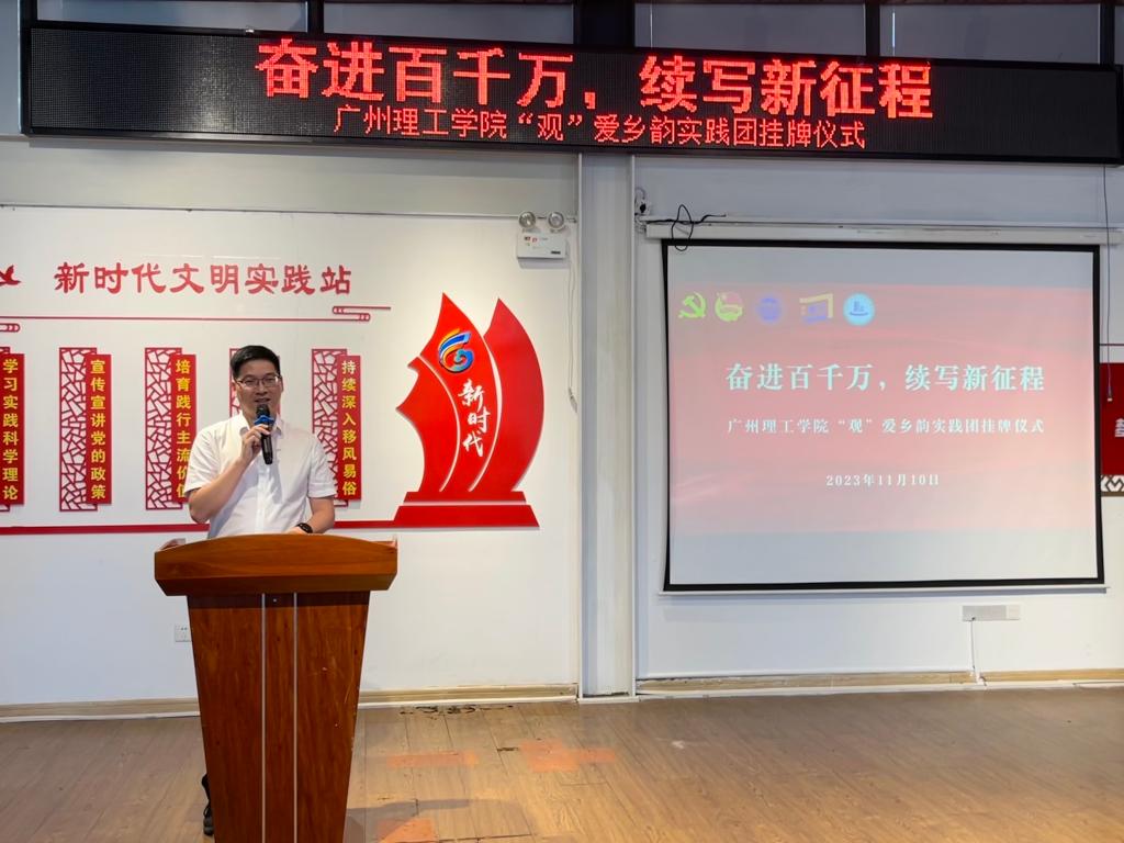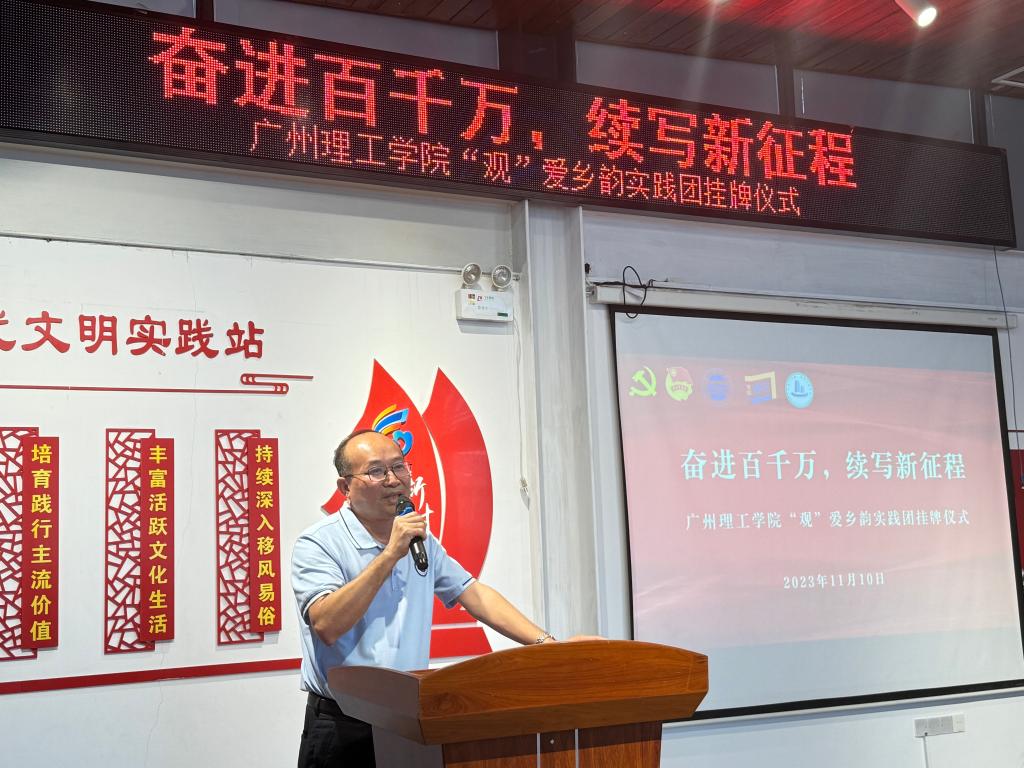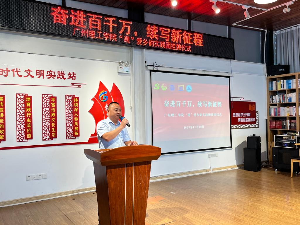(阴凡 梁宇铭)11月10日下午,广东青年大学生“百千万工程”突击队行动项目williamhill中国官网“观”爱乡韵实践团在惠州市博罗县罗阳街道观背村回顾展示了暑期社会实践活动成果,并举行挂牌仪式。共青团博罗县委副书记朱懿,罗阳街道办副主任、团工委书记林康健,观背村党支部书记郑国雄,williamhill中国官网党委书记黄圣诚,党委委员、副校长张志红出席活动,williamhill中国官网党委工作部副部长陈朝阳,williamhill中国官网党总支副书记阴凡、团委副书记林国健以及“观”爱乡韵实践团主要成员参加了仪式并作交流。