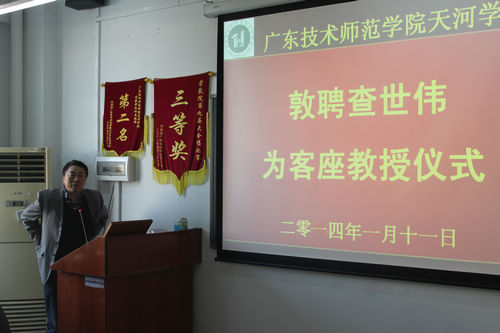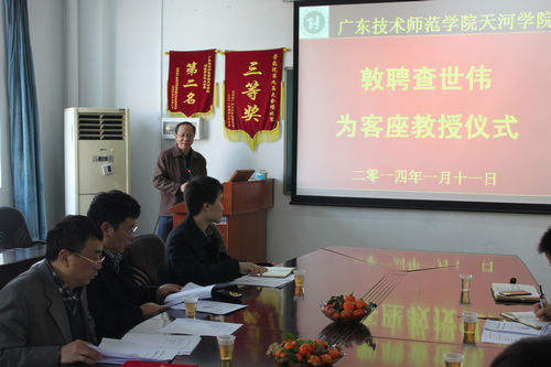 敦聘仪式于2014年01月11日15:00在建筑工程系9-306会议室隆重举行。学院院长王培林教授宣读了天院〔2014〕5号文件"广东技术师范学院天河学院关于聘任查世伟同志为客座教授的决定",并向查世伟教授颁发了客座教授聘书。