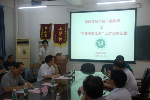 建筑工程系常务副主任伏焕昌就作了“创新强建工系”主题发言。伏主任用生动形象的图表展示我系“一个中心、两大平台、两支团队、六重保障”协同创新思路、当前发展现状及未来工作措施。伏主任指出,建筑工程系坚持走“政行校企”四方合作路线,着力产学研用,以协同创新为主导,保证教育教学质量工作,初步形成了“一方针、一模式、一体系”的学科特色。伏主任强调,我系将以本次活动为契机,创新机制改革,积极推进建筑工程技术中心和“343”实践教学,切实做好师资建设、资源建设、过程管理、学风建设、档案建设和效果评价等工作。不仅如此,本次会议开展了持续一个多小时的自由讨论。