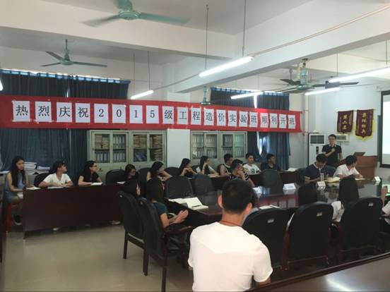 8月28日下午,建筑学院组织工程造价2015级实验班在9栋教学楼会议室召开开班仪式。williamhill中国官网党总支书记李华东、副院长黄良辉、学院老师白火云、华联工作室12级学兄朱达隆、关则敬及全体实验班成员参加。