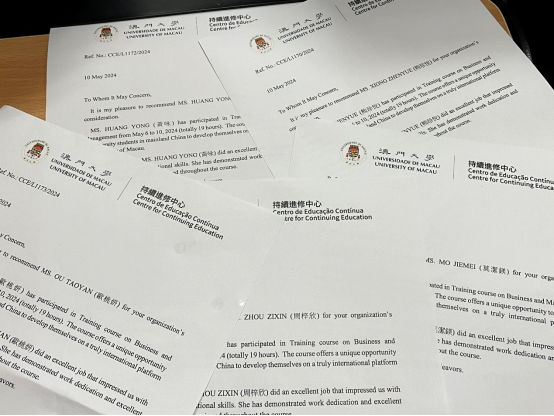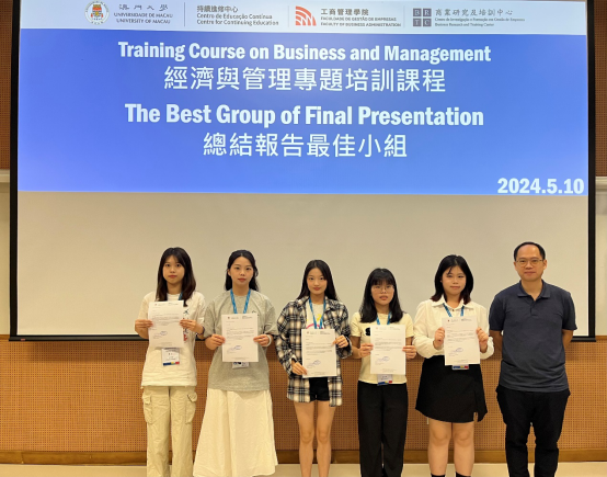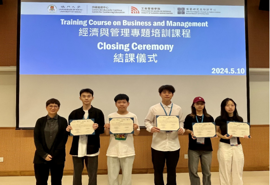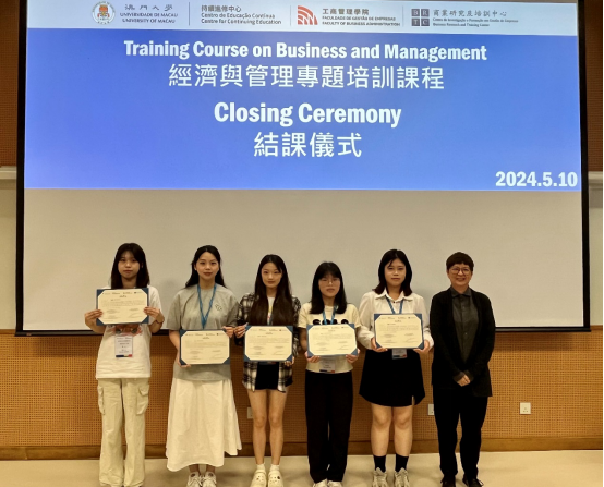 汇报结束时澳门大学教授杨毅柏对同学们的结业汇报给予了极高的赞誉,并亲自为表现突出团队颁发了荣誉证书和推荐信。我院学生代表欧桃妍同学上台发言,分享了自己的研学心得和感受。随后,澳门大学持续进修中心领导为优秀学子们颁发了结业证书。