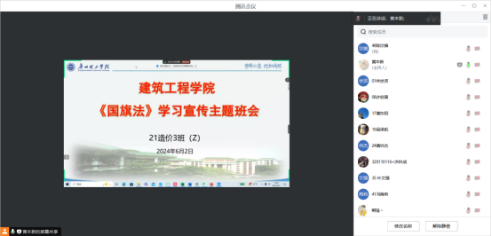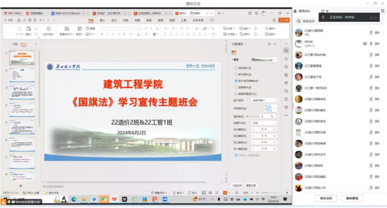 在班会中,各班班长首先介绍了班会的目的和意义,强调了国旗法的意义与作用。随后,各班班长就国旗种类规格、国旗使用与礼仪、国旗法的制定与实施等方面进行了详细的讲解,同时通过相关法律法规、传达典型案例等方式进一步提高了同学们的国旗法意识和国家观念,弘扬了爱国主义精神,振奋了民族精神,形成自觉维护国旗尊严,尊重和爱护国旗的浓厚氛围。