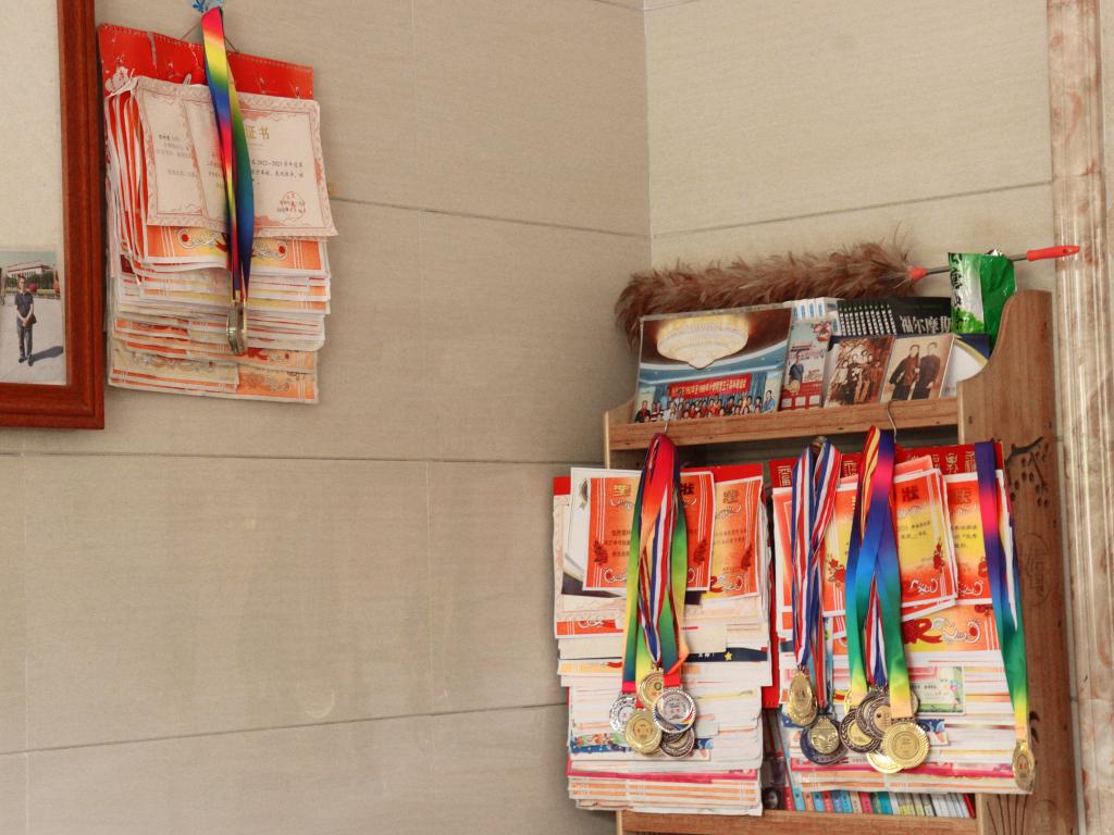 老干部张丁友家中挂满了孙子孙女们的奖状和奖牌