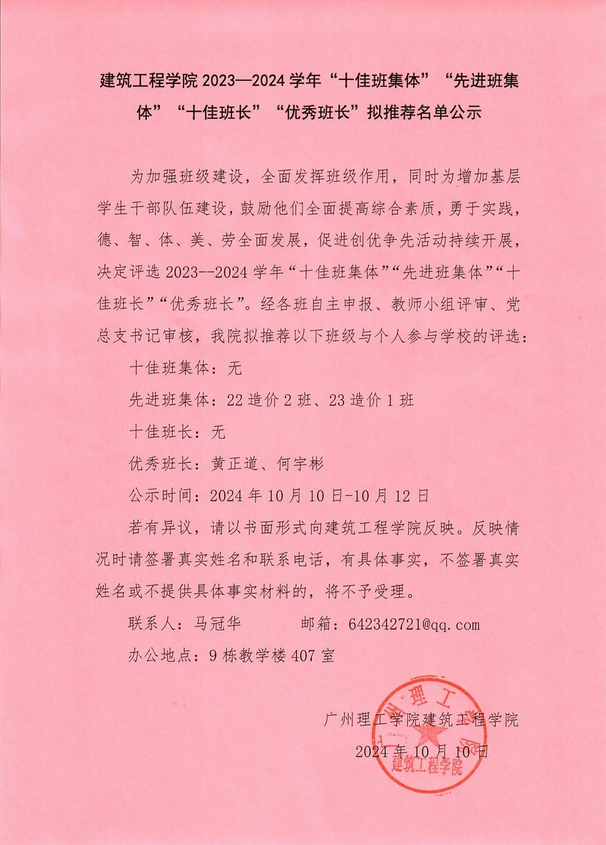 williamhill中国官网2023—2024学年“十佳班集体”“先进班集体”“十佳班长”“优秀班长”拟推荐名单公示