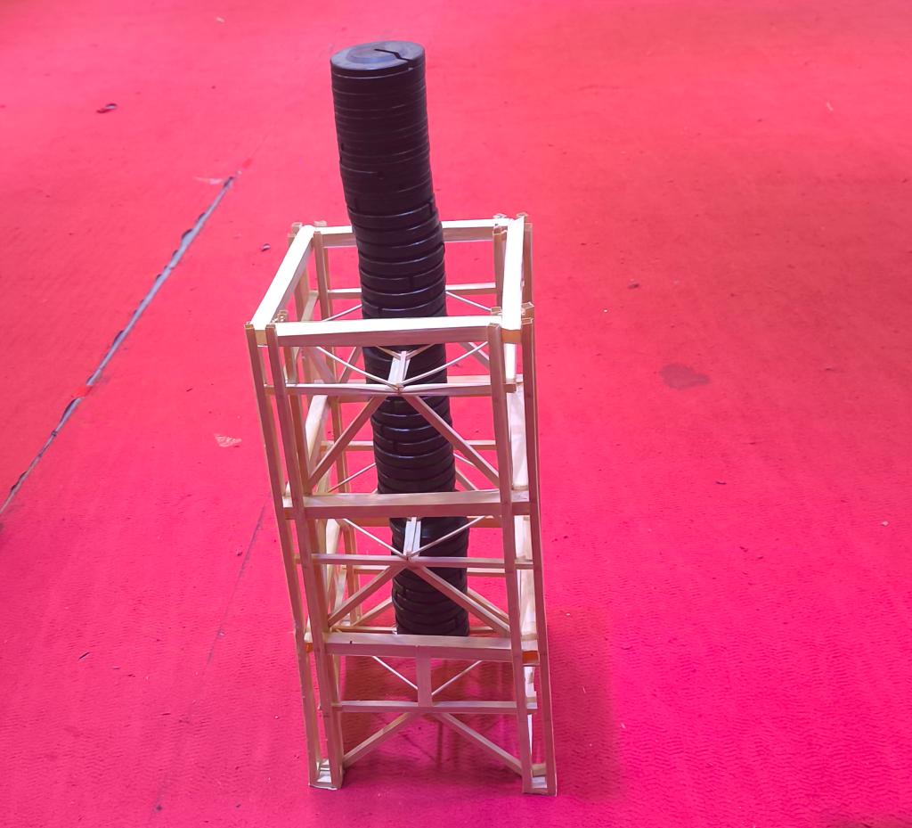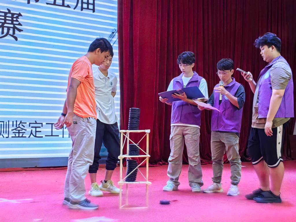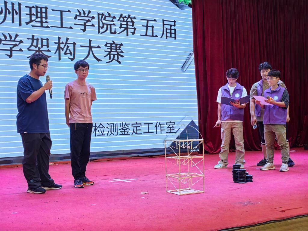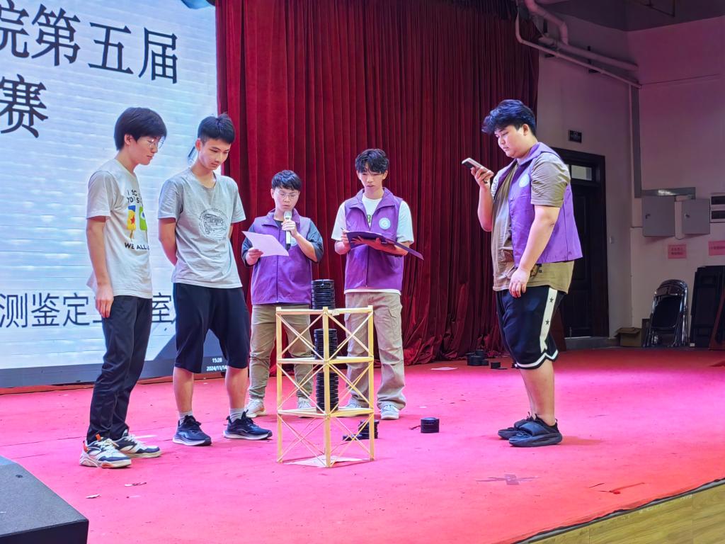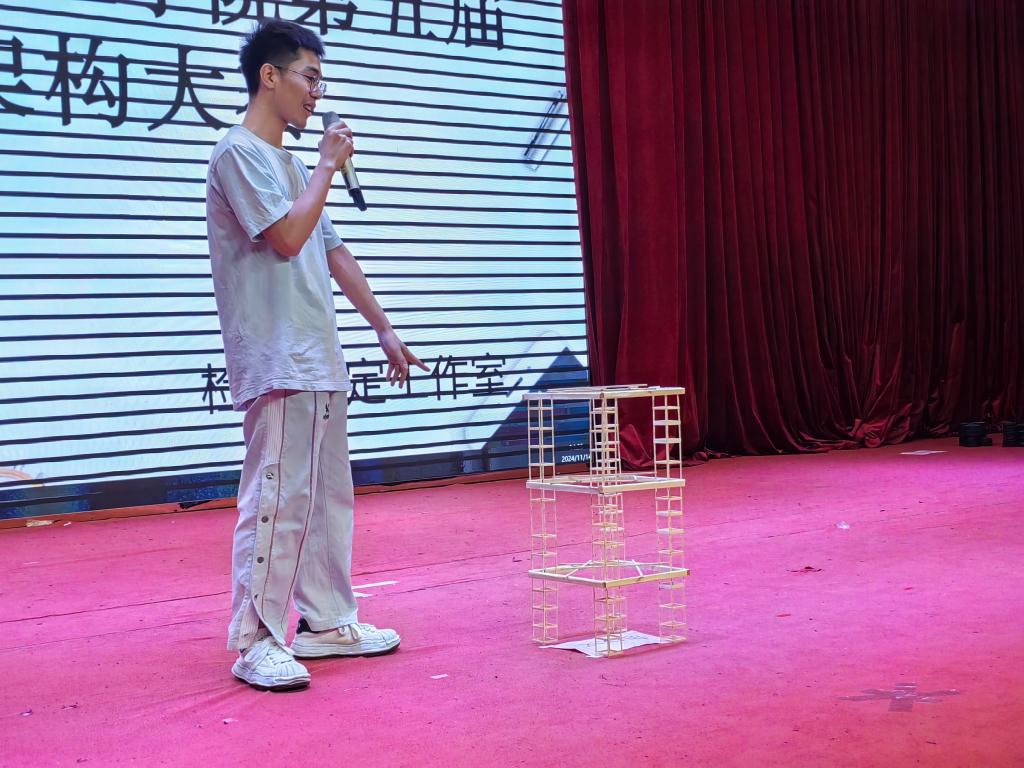 赛前,选手携带各自模型入场签到,由工作人员负责给各参赛作品称重和测量模型尺寸。本次比赛共有18支队伍报名参加。比赛伊始,李棱雪副院长上台致辞,李院表示,williamhill中国官网一直以来都高度重视力学学科的发展,致力于培养具有创新精神和实践能力的力学人才,希望同学们能够充分发挥自己的想象力和创造力,勇于尝试、敢于创新,不要畏惧失败,也希望各位参赛选手能够赛出风格、赛出水平,展现出新时代青年的风采!最后预祝本次力学架构大赛取得圆满成功!紧接着,工作室指导老师陈奕宣布比赛开始。随后,参赛队员依次上台首先介绍自己的模型设计理念和制作过程,有的队伍采用了创新的几何结构,利用三角形的稳定性原理,巧妙地分散了压力,即便是在砝码不断增加的情况下,依然稳如泰山;有的则通过精密的计算与模拟,设计出了看似脆弱实则坚韧的网状结构,每一次砝码的添加都仿佛在向世界宣告着他们对力学奥秘的深刻理解。接着,各参赛队伍选好自己本组所需加载的砝码,随着砝码一个个被小心翼翼地添加到精心设计的架构之上,现场的气氛逐渐升温至沸点。这些砝码,不仅仅是重量的象征,更是对参赛队伍智慧与团队协作能力的考验。每一次成功的加载,都伴随着观众席上传来的惊叹与掌声,那是对参赛者不懈努力与卓越成就的认可与鼓励。