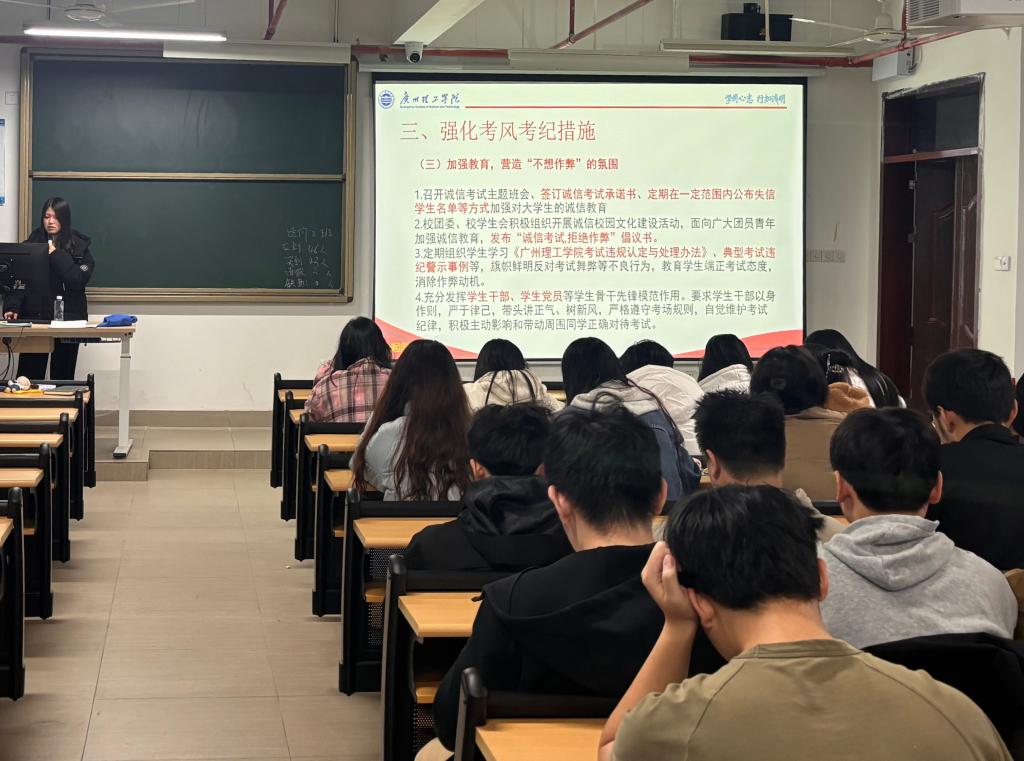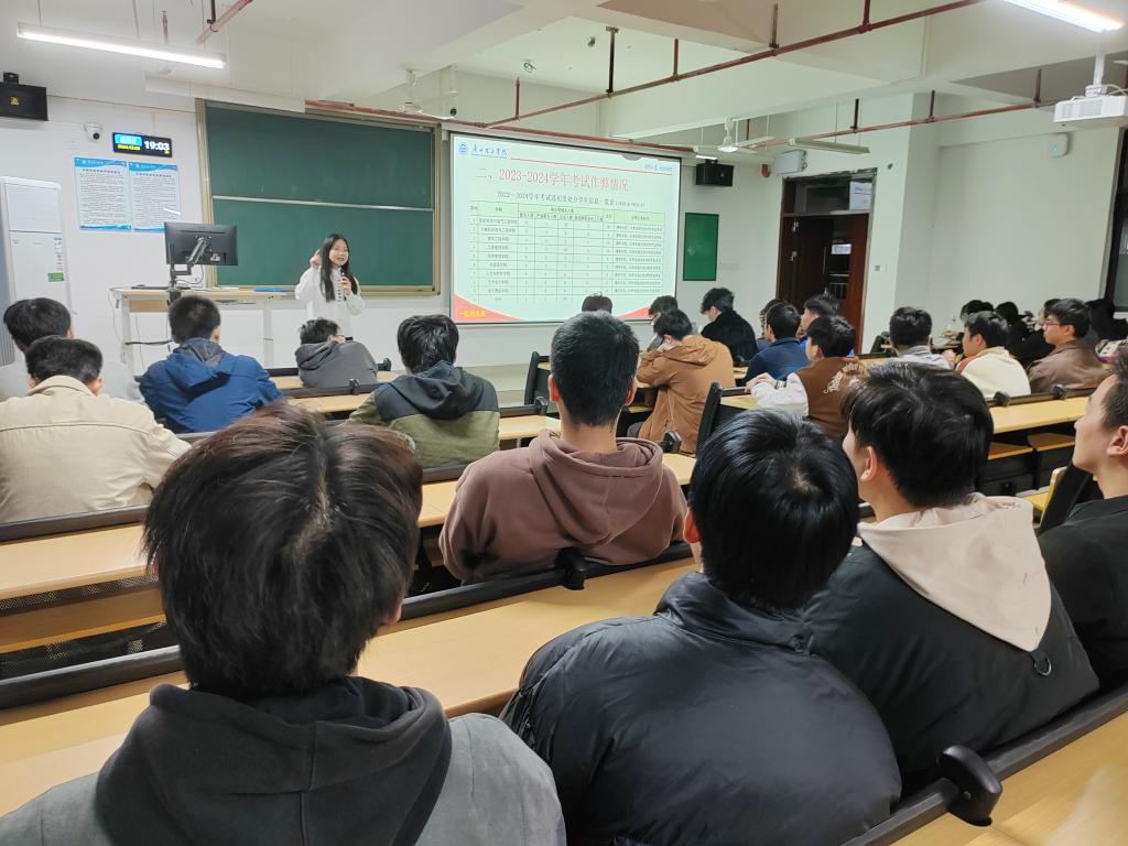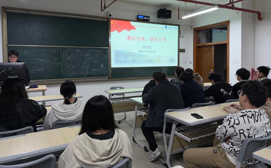 班会上,各班班长着重强调了考试纪律,明确禁止携带手机等电子通讯工具进入考场,要求学生严格遵守考场规则,坚决杜绝作弊、抄袭等行为,以诚信态度对待每一场考试。此外,各班辅导员在会上指出,“没有好的考风,难求好的学风”。诚信考试不仅是个人品德修养的重要体现,更是对知识的尊重与敬畏,并且鼓励同学们从自身做起,凭借自身真实实力应考,共同营造公平公正、积极健康的考试环境。