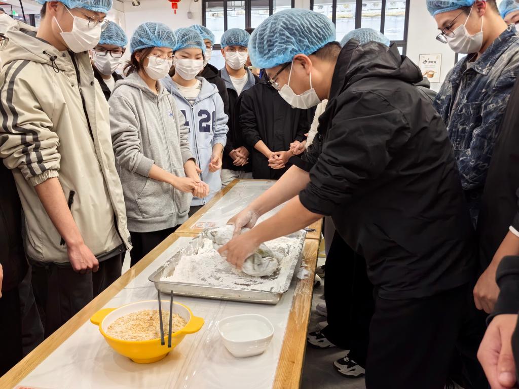 活动伊始,辅导员潘雨桐详细介绍了青团的历史背景、文化内涵及制作流程。在青团制作指导老师的现场讲解教学下,学生们被分成若干小组,开始动手实践青团的制作。小组内的同学们密切合作,相互学习,共同解决制作过程中遇到的问题。他们揉捏着糯米团,包裹着馅料,逐渐掌握了制作青团的技巧,制作出一个又一个青团。这些青团形态各异,色泽诱人,散发着艾草的清香。活动现场充满了欢声笑语,同学们在忙碌中享受着制作的乐趣。