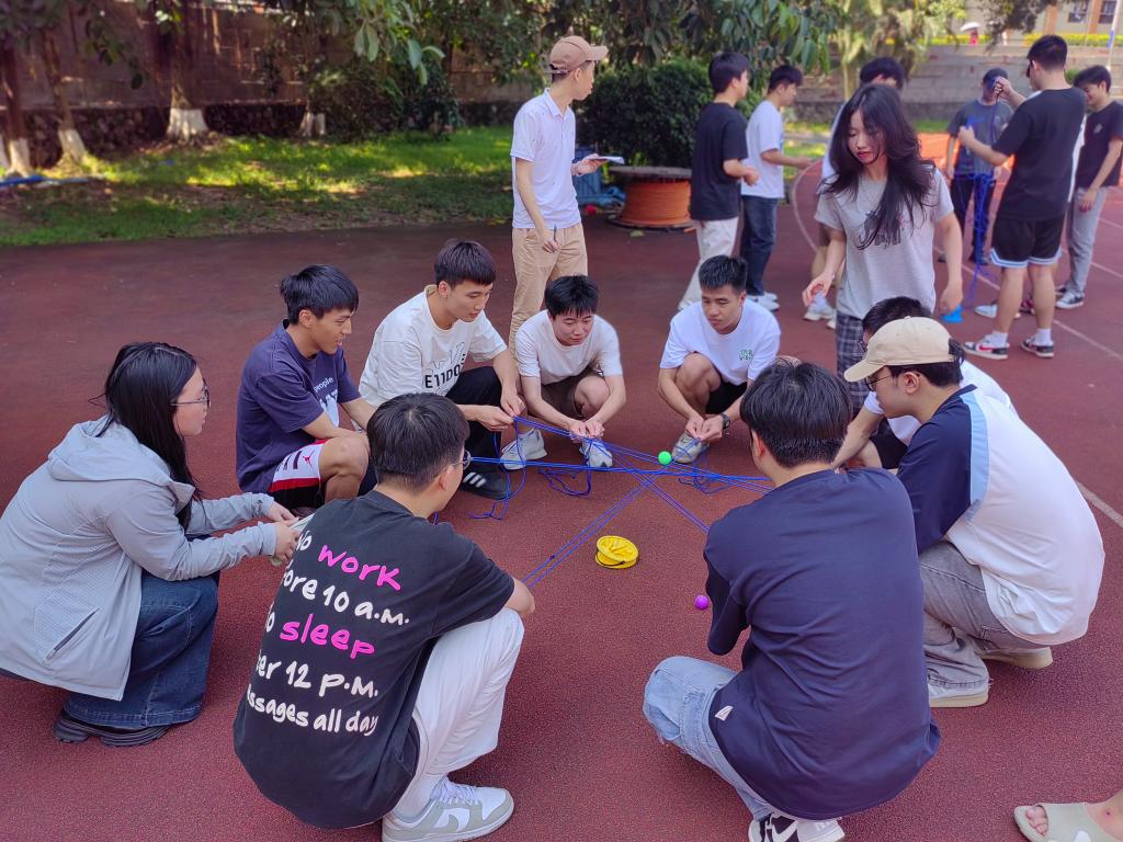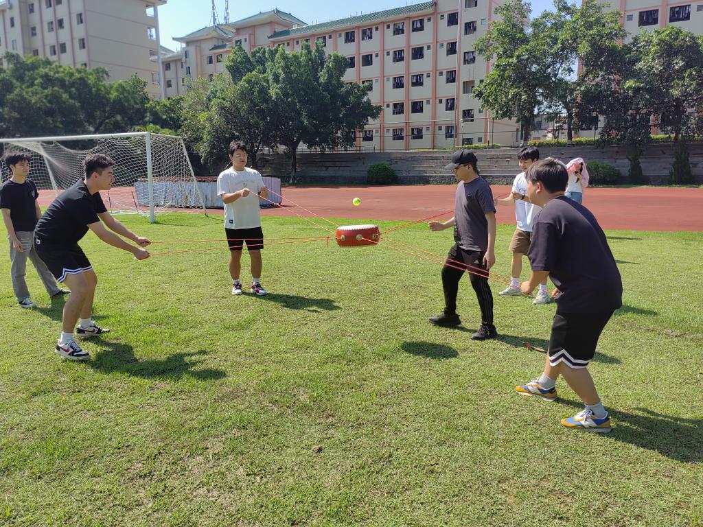 本次运动会设置同心击鼓、你拉我跳、无敌风火轮、过河拆桥、巨人脚步、传球纵横六大项目,每个项目都独具特色,充分考验着参赛队伍的团队协作能力和应变能力。活动开始前,工作人员将参赛选手分为13组并详细讲解了同心击鼓、你拉我跳等活动项目的具体规则。在活动中,同心击鼓项目要求队员牵拉绳索控制鼓面颠球,需高度集中注意力并默契配合,调整鼓面角度和力度,每一次颠球成功都引发欢呼,极大考验团队默契与协调能力;你拉我跳项目中,两人一组,拉绳者与跳绳者配合默契,现场加油声不断,展现彼此信任;无敌风火轮项目里,队员钻进用报纸、胶带制作的“履带”,需合理站位、齐心协力移动,比赛充满欢声笑语,尽显团队智慧与速度;过河拆桥项目中,团队借助有限纸板在模拟“河面”前行,需规划传递、默契接力,灵活应对突发状况,体现团队协作与应变能力;巨人脚步项目要求队员双脚固定在木板上,喊口号协调迈步,考验组织与同步性,展现强大凝聚力;传球纵横项目则需团队接力传递小球,队员专注耐心、紧密配合,展现团队精神与对细节的关注。