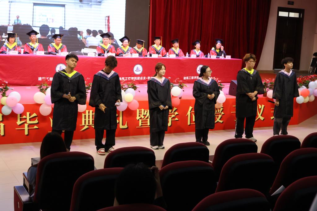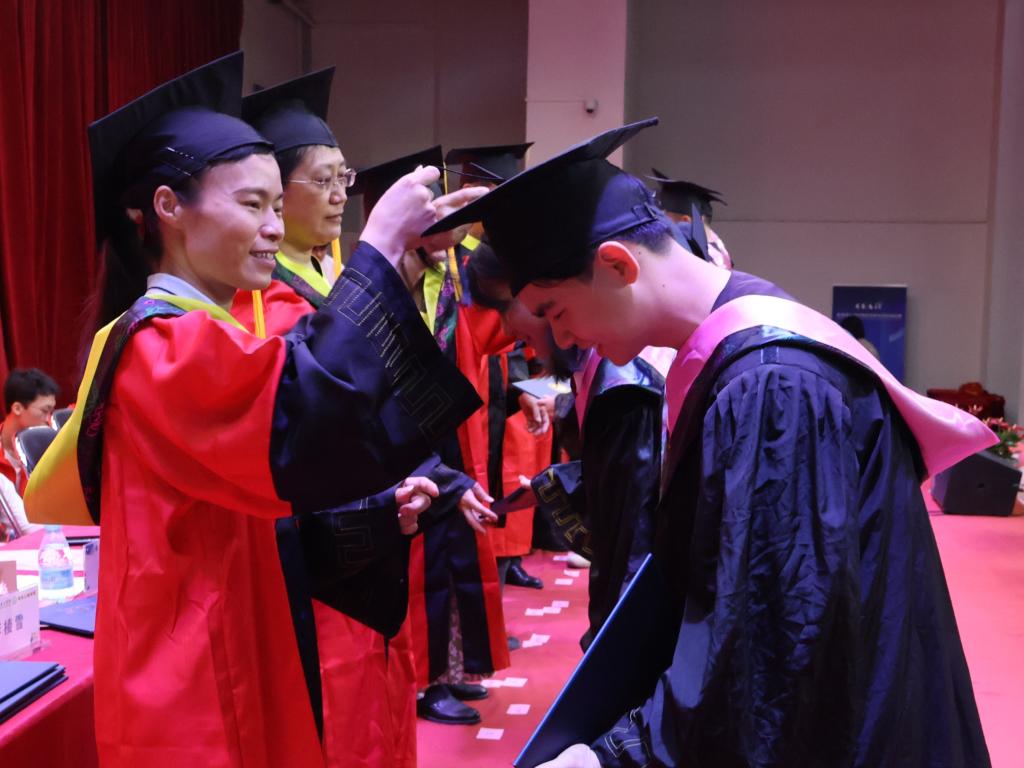 学院领导和教师们为毕业生们拨穗正冠,授予学位证书,并与他们亲切握手拥抱、合影留念。