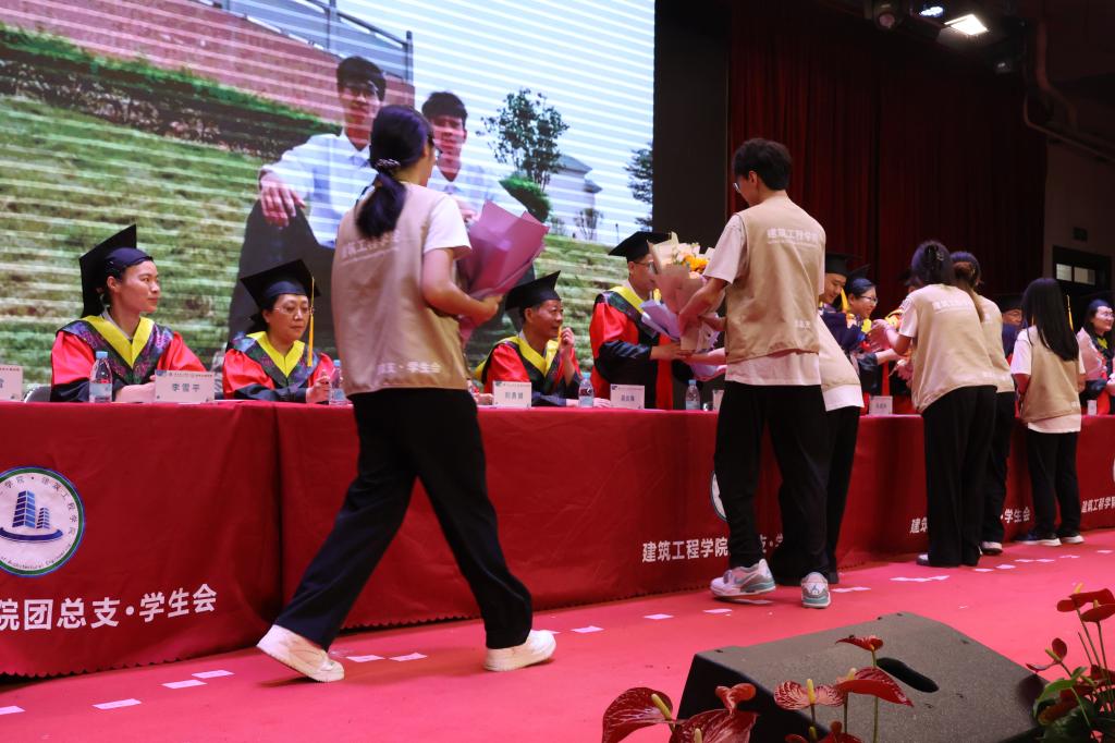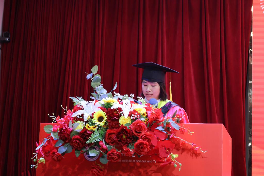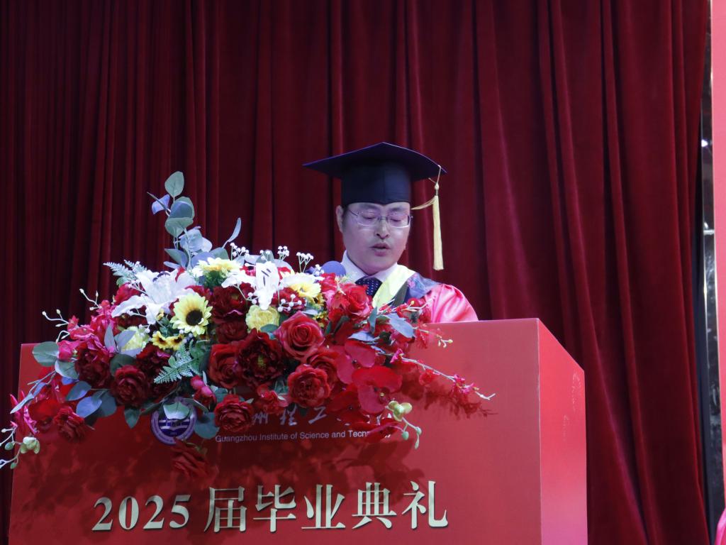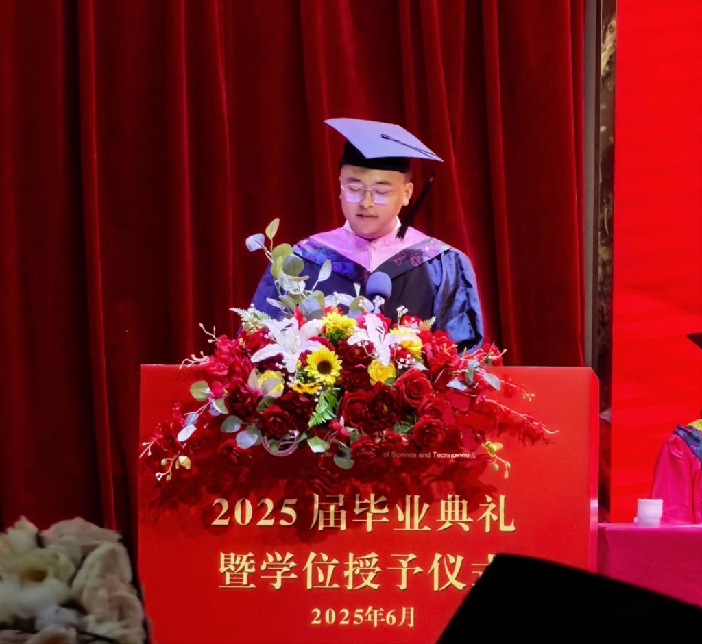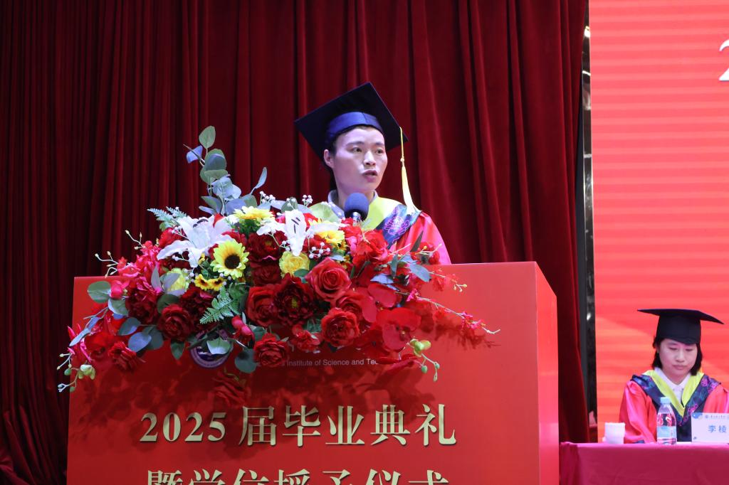 毕业生代表姚章泽同学发言,他回顾了大学期间的点点滴滴,从课堂上的专注学习,到实验室里的探索实践,从校园活动中的欢笑,到面对困难时的相互扶持,每一个瞬间都历历在目。他向悉心教导的老师、并肩奋斗的同学表达了深深的感恩。同时,姚章泽同学也坚定地表示,未来将带着在学校学到的知识与技能,勇敢地迎接新挑战,在各自的岗位上发光发热,为母校争光。