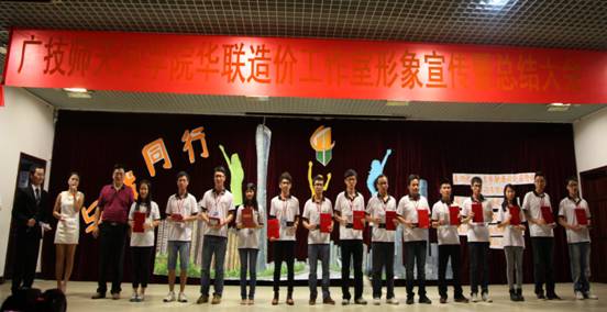 在极炫舞协会的激情劲舞下,晚会正式开始。工作室的负责人黄良辉老师的热情演讲及播放的精美视频的介绍了工作室运营状况,激发了同学们对华联造价工作室的无限遐想与向往。工作室成员代表林辉昭、钟楚玲对参加工作室的真心感悟道出参与华联造价工作室苦与乐,感染了台下众多新生。华联公司的行政总监吴江及我院副院长周玉霜的一番话语,更是引人深思,使此次总结大会的精神提升到了另一个高度。晚会中间穿插的由零距离话剧社、华联造价工作室的小品、音乐朗诵、歌曲对唱节目更是引爆全场,把晚会推向一个又一个高潮,全场一片欢呼,激情不断。最激动人心的是江总监为华联工作室的林辉昭、朱达隆、何佩玲等15位优秀成员进行了颁奖。