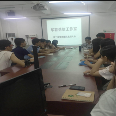 9月10日晚上,华联造价工作室在9栋教学楼隆重举行华联造价工作室第三期管理团队换届大会,华联公司驻校工程师邱曼青、工作室各部门干部以及新一期管理团队全体成员出席本次大会。