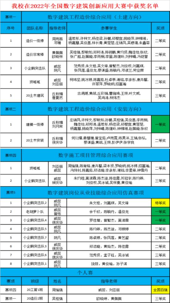 在数字建筑岗位从业技能综合应用仿真赛项中,戚蕊、阴凡老师指导的“小企鹅突击队2”获得特等奖;戚蕊、曾栋老师指导的“老胡萝卜队”获得一等奖;戚蕊、侯庆华老师指导的“小企鹅突击队4”获得一等奖;戚蕊、阴凡老师指导的“小企鹅突击队5”获得二等奖;阴凡老师指导的“小企鹅突击队7”获得二等奖;戚蕊、侯庆华老师指导的“小企鹅突击队3”获得二等奖;戚蕊、侯庆华老师指导的“小企鹅突击队6”获得三等奖;戚蕊、阴凡老师指导的“小企鹅突击队1”获得三等奖。