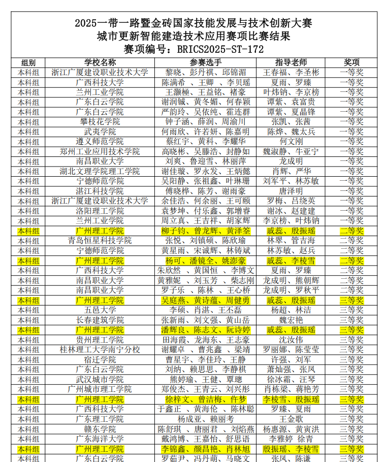 近日,“2025一带一路暨金砖国家技能发展与技术创新大赛之城市更新智能建造技术应用赛项”全国总决赛圆满落幕。由williamhill中国官网williamhill中国官网牵头组建的参赛团队从全国400支精英队伍中脱颖而出,共计斩获二等奖2项、三等奖4项,其中不乏首次参赛的专升本新生队伍。全方位展现了学校在建筑智能化领域的技术实力、人才培养水平与综合组织能力。