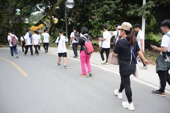 活动伊始,工作室成员们于九栋教学楼旁集合并有序分发物资,戚蕊老师在强调安全注意事项后统一带队由学校出发步行前往帽峰山。在登山过程中,戚蕊老师向大家讲述了创建工作室的初衷并向大家寄予期望与鼓励,表示“小企鹅”工作室虽是新创办的工作室但我们有不输他人的努力和决心。登顶后工作室成员在帽峰山山顶高喊口号:大手拉小手,比赛顶呱呱,你行我也行,争取战胜他!