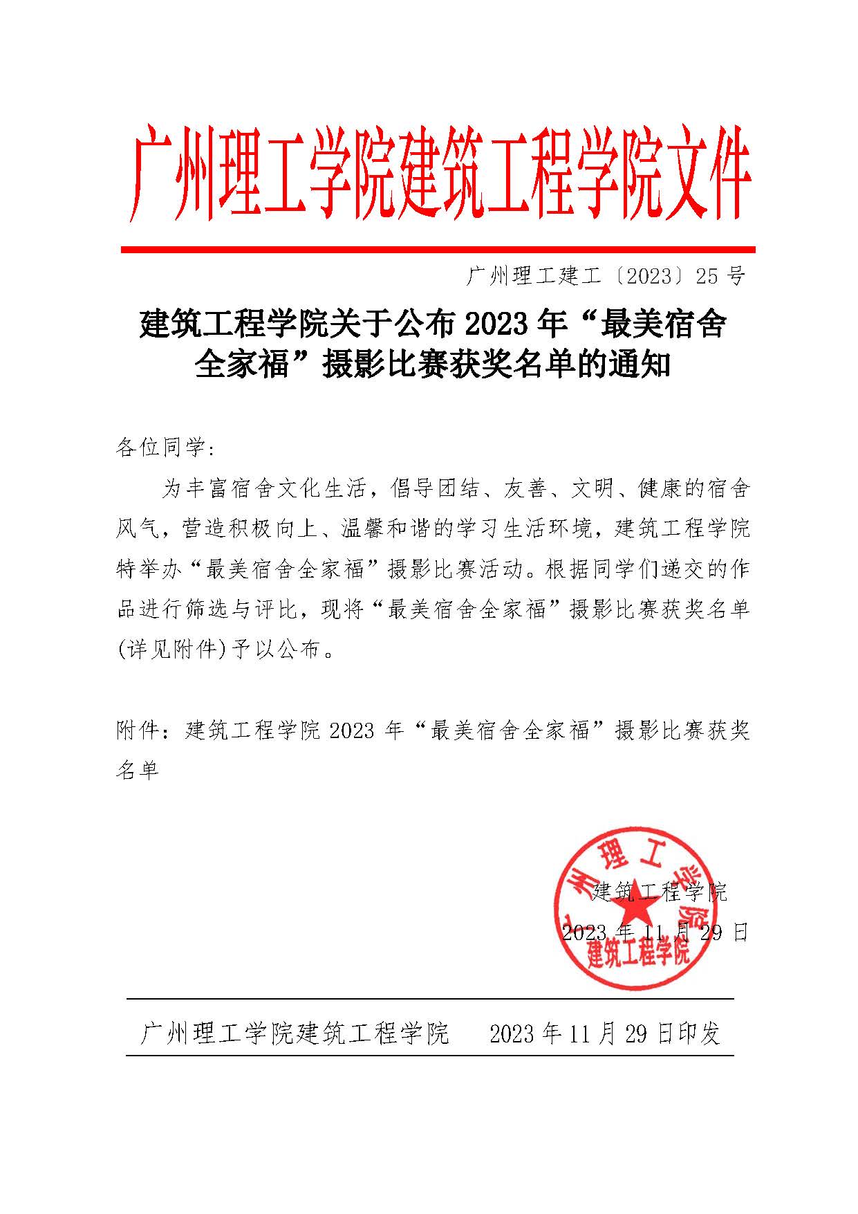 广州理工建工〔2023〕25号-williamhill中国官网关于公布2023年“最美宿舍全家福”摄影比赛获奖名单的通知