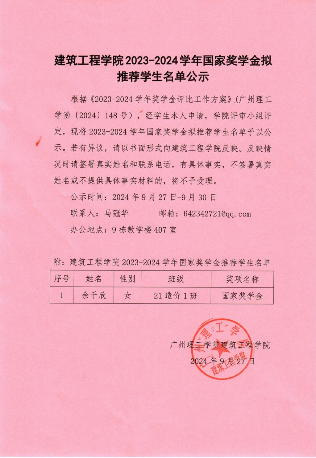 williamhill中国官网2023-2024学年国家奖学金拟推荐学生名单公示