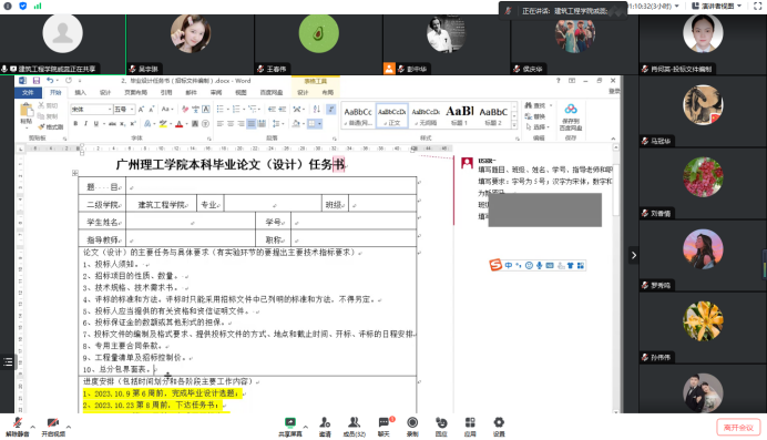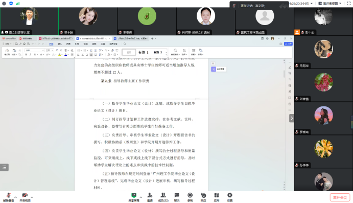 (通讯员吴宇琳)10月13日下午,为更好地推进我院本科毕业论文(设计)指导工作,帮助新进教师深入了解毕业论文(设计)各环节程序,保障学生毕业论文(设计)质量,保证2024届毕业论文(设计)工作顺利开展。williamhill中国官网工程管理系召开2024届毕业论文(设计)指导教师线上工作会议,对毕业设计指导工作总体要求及近期工作安排进行部署。系部全体毕业设计指导教师参加会议。系副主任黄佩佩主持。
